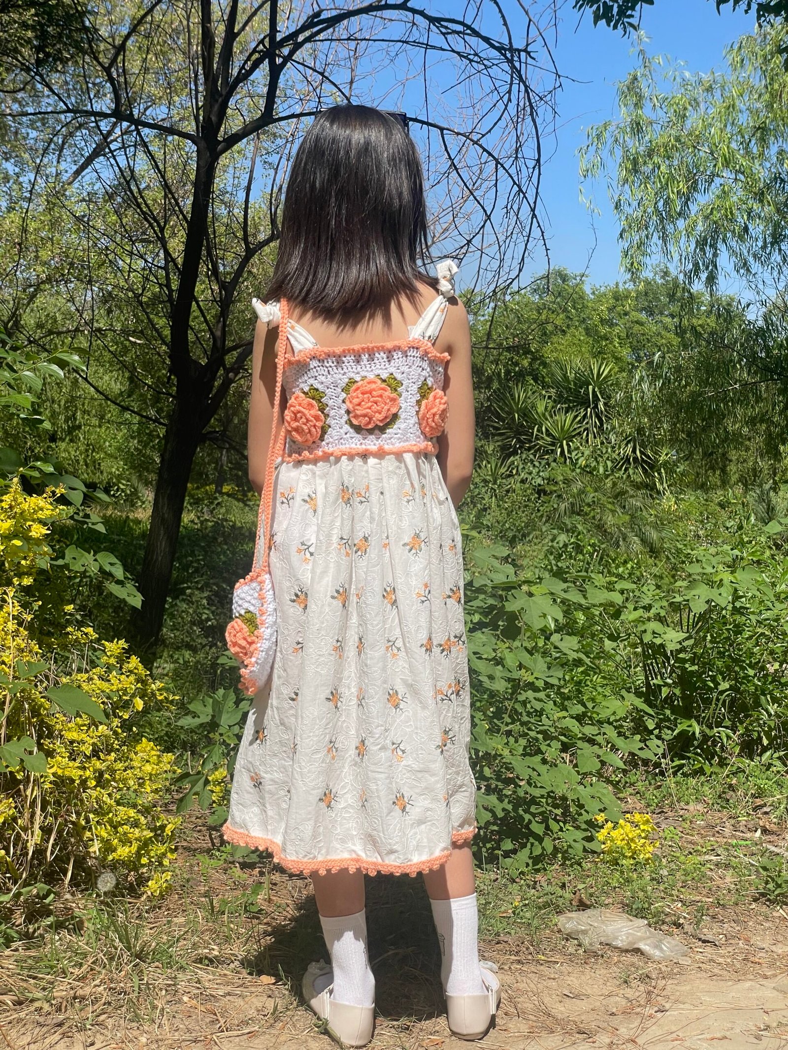 Peach Crochet Kids Frock with Matching Handbag – Handmade Elegance for Little Ones