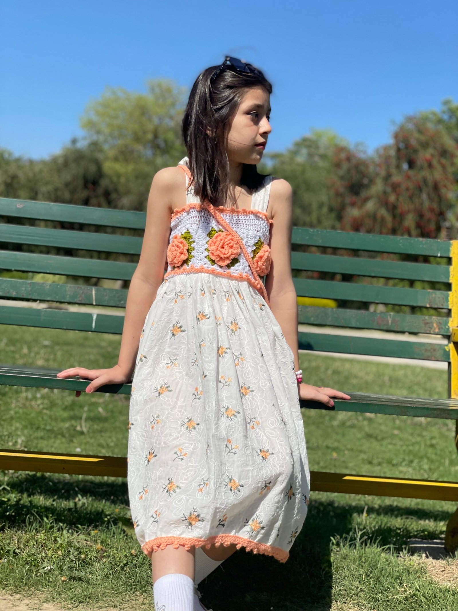 Dress your little one in charm and comfort with our handcrafted Crochet Kids Frock in a soft peach and white, beautifully designed to bring out their sweet and playful side. Made with love and attention to detail, this frock features delicate stitching, breathable yarn, and a lightweight design—perfect for birthdays, family gatherings, or casual days out.