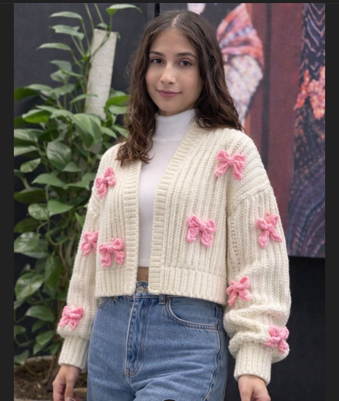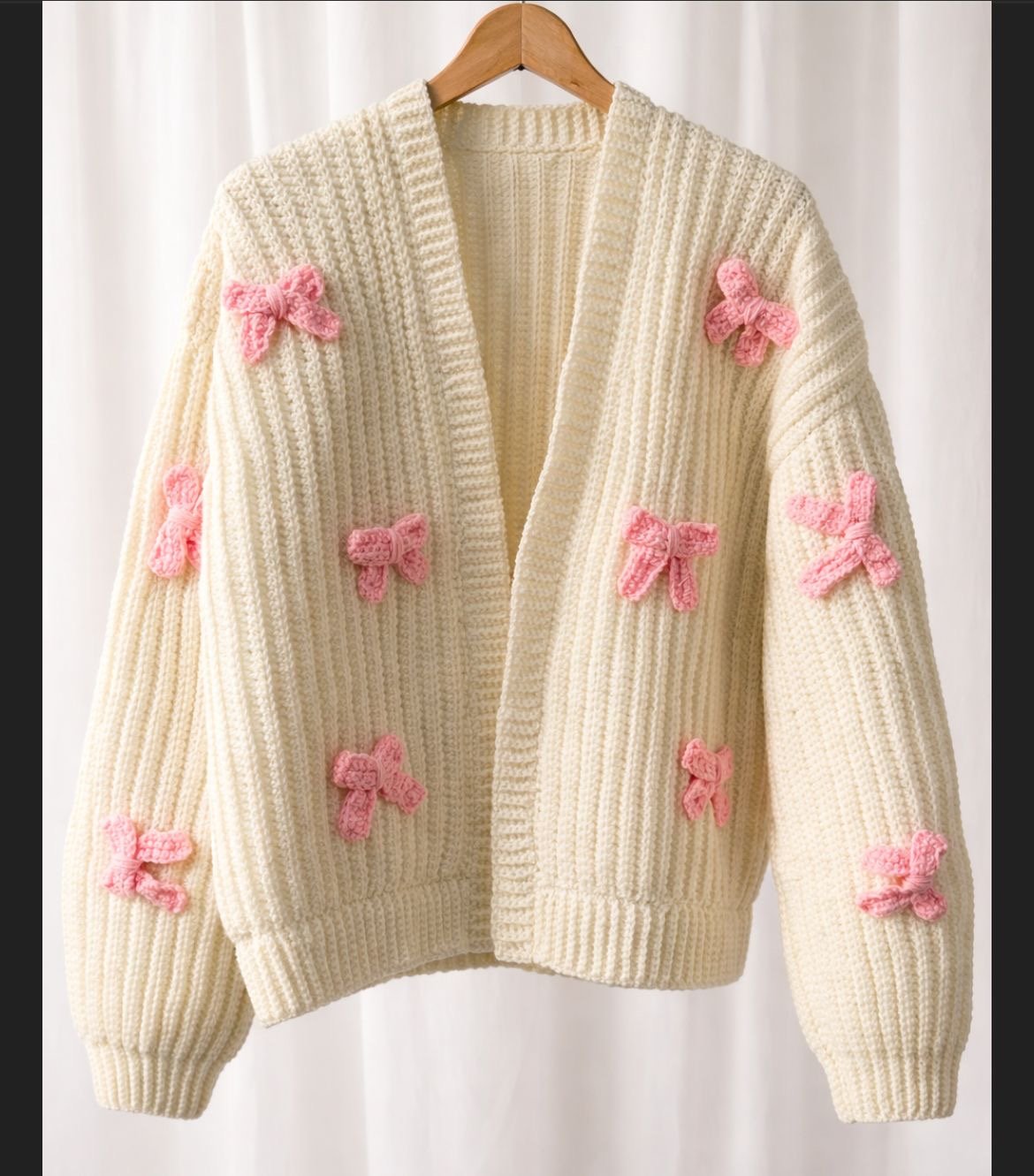 A-Handmade white cardigan with pink bow